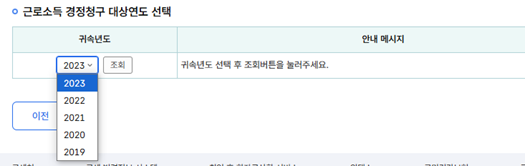 > 대상연도를 선택해 주세요.(5년치 가능합니다.) '23년의 경우, 회사에서 '24.3.10.까지 연말정산 신고를 했을 것이고, '24년 8월 경 위와 같이 경정청구 대상연도 선택 가능하도록 오픈 되었습니다. (통상 대상연도 다음 해 7~8월 경 오픈 되나, 해마다 약간 차이가 있는 듯 합니다.)