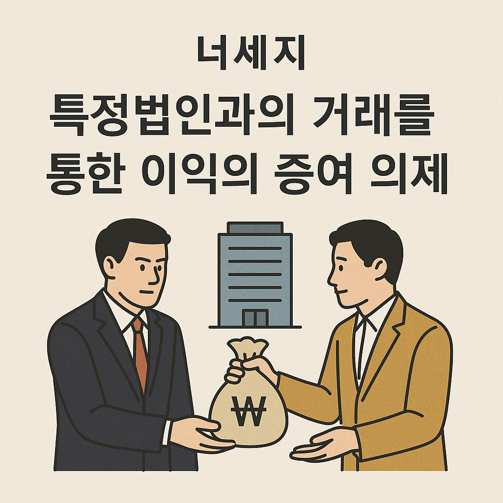 | 적용조건 | ①나와 친족이 30% 이상 직·간접 지분을 보유한 법인(특정법인)이 ②나의 특수관계인으로부터 이득을 얻게 되는 다음의 경우 - 재산 또는 용역을 공짜로 제공 받음 - 재산 또는 용역을 싸게 양도·제공 받음(시가의 30% 이상이거나 3억원 이상의 차액인 경우) - 재산 또는 용역을 비싸게 양도·제공 함(시가의 30% 이상이거나 3억원 이상의 차액인 경우) - (개정 : '25.3.14 이후 거래분부터) 불균등 감자 등 자본거래를 통하여 이익을 분여 받음 - 채무 면제·인수 또는 변제 받음(합병 또는 분할 해산이 아닌 해산 중 분배할 잔여재산 없는 경우는 제외) - 시가보다 낮은 가액으로 현물출자 |